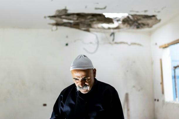A member of the Druze community assesses the damage in a building that was hit overnight by a rocket fired from Lebanon, in the city of Shefa-Amr, or Shefar'am, east of Haifa in northern Israel