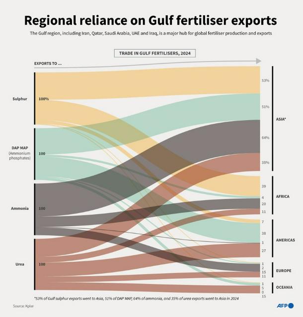 Gulf countries are major exporters of nitrogen fertilisers like urea – which provides plants with nitrogen to aid green leafy growth – as well as ammonia and phosphate.