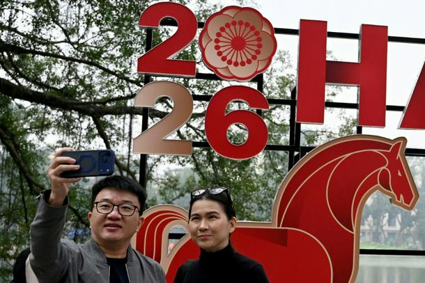 A couple takes a selfie next to a New Year's banner in Hanoi