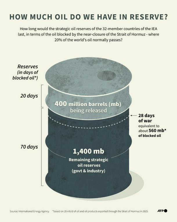 Infographic showing the amount of strategic oil reserves being released and how much remains among the 32-member countries of the International Energy Agency, after the near closure of the Strait of Hormuz due to the Middle East war