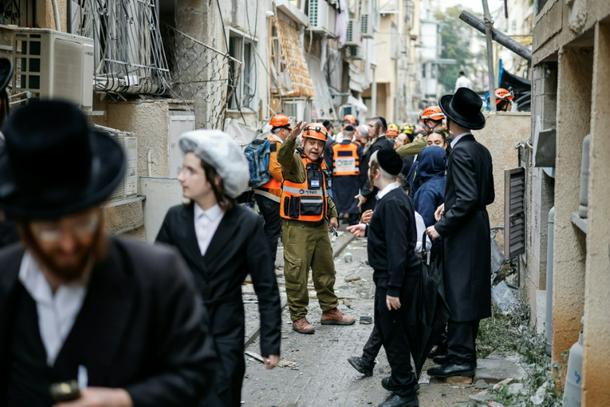 A rescuer gestures as Orthodox Jews stand at the scene of an Iranian strike over Bnei Brak in central Israel