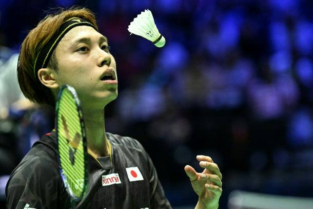 Japan's Kodai Naraoka tosses up a shuttlecock at the badminton world championships in Paris on August 28