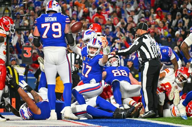 Buffalo's Josh Allen, center, scored on a one-yard touchdown run to help spark the Bills over Kansas City 28-21 in an NFL game
