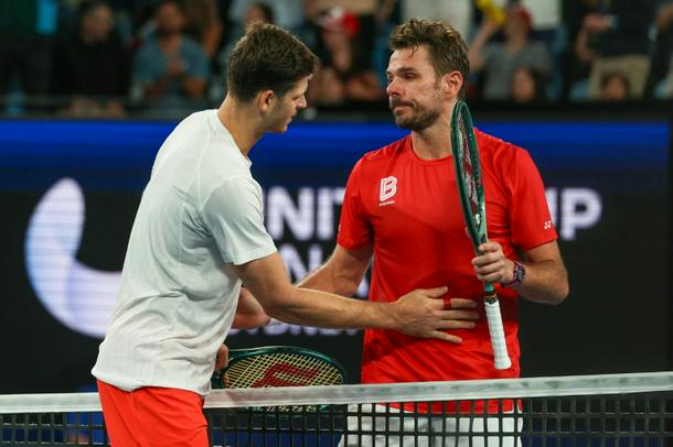 Hubert Hurkacz (left) is congratulated by Stan Wawrinka after their singles in the United Cup final in Sydney