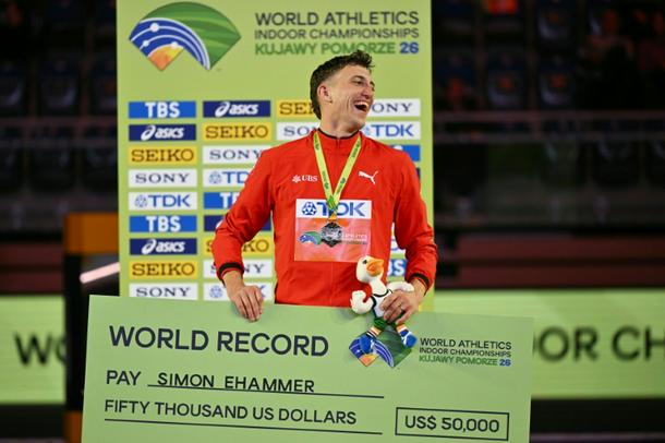 Switzerland's Simon Ehammer with a cheque for his world record