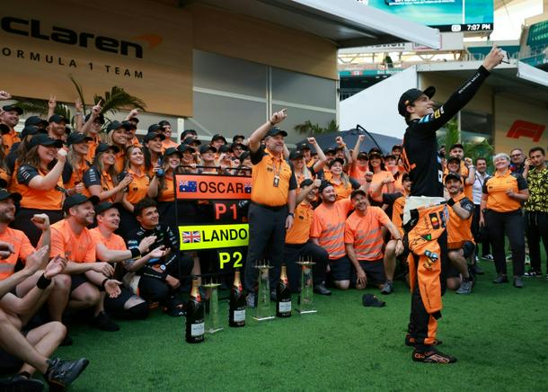The McLaren team celebrate their 1-2 in Miami after Oscar Piastri crossed the line ahead of Lando Norris