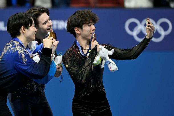 Capturing the moment: Kazakh Mikhail Shaidorov (centre) won Olympic men's figure skating gold
