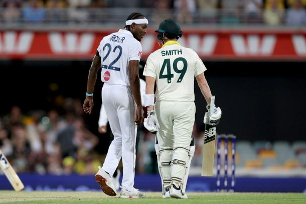 Australia captain Steve Smith (R) and England’s Jofra Archer on day four of the second Test