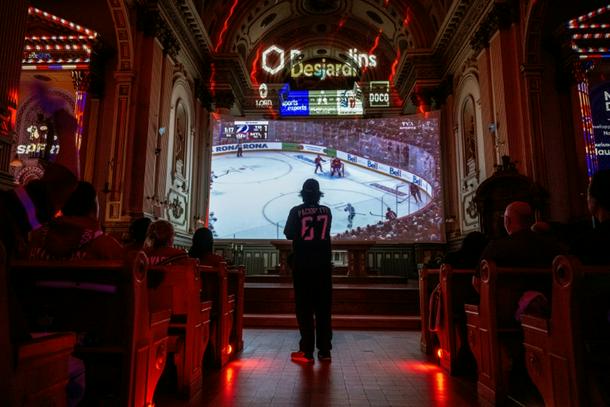 It took months of work, but by the time the NHL playoffs started, the ornate Cathedral of St John the Evangelist in Saint-Jean-sur-Richelieu, Quebec was ready to host – with a projection screen strung across the sanctuary.