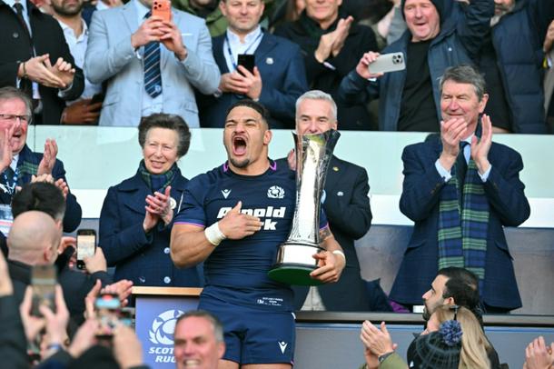 Scotland captain Sione Tuipulotu lifts the Auld Alliance trophy after his side's 50-40 Six Nations win over France at Murrayfield