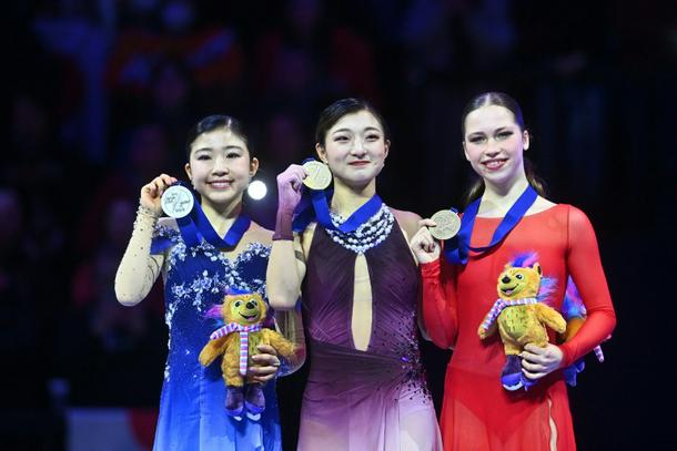 Four-time gold medallist Kaori Sakamoto (centre) with Japanese teammate Mone Chiba (L) and bronze medal winner Belgium's Nina Pinzarrone in Prague