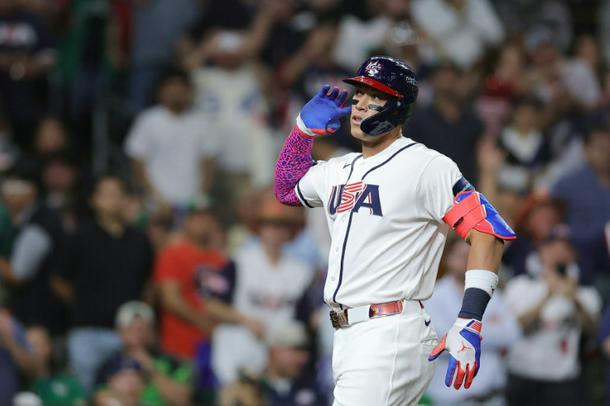 That three-run shot sent Kyle Schwarber and Cal Raleigh over home plate and gave the USA a 5-0 lead.