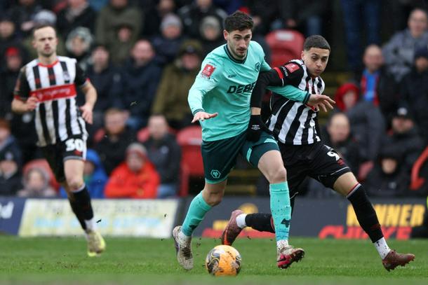 Wolves match-winner Santiago Bueno runs past Grimsby's Jaze Kabia during their English FA Cup fourth round tie