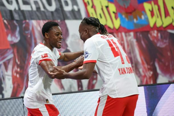 Leipzig midfielder Ridle Baku (left) celebrates with winger Yan Diomande