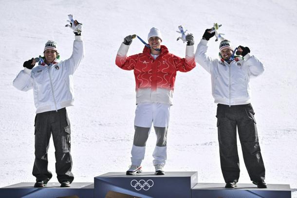 Switzerland's Franjo von Allmen (C) poses with Italy's Giovanni Franzoni (L) and Dominik Paris (R)