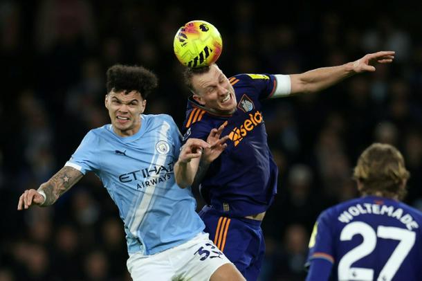 Manchester City's Nico O'Reilly (L) in action against Newcastle