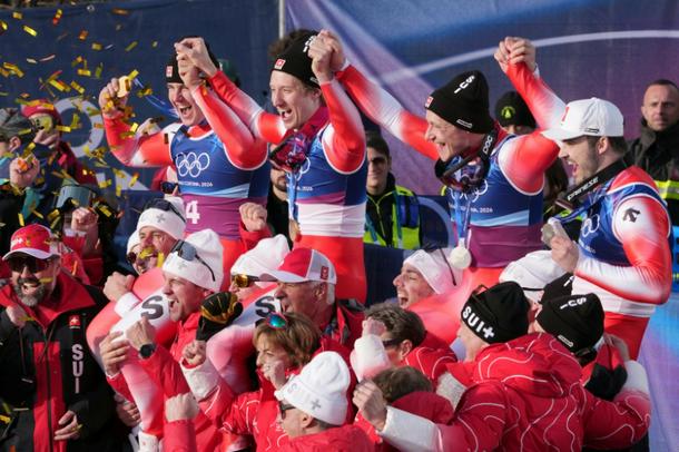 Switzerland's Franjo von Allmen and Switzerland's Tanguy Nef (L) celebrate with Marco Odermatt and Loic Meillard (R) after the men's team combined