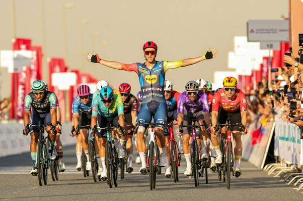 Jonathan Milan celebrates a second straight sprint victory as he takes the the fifth stage of the UAE Tour