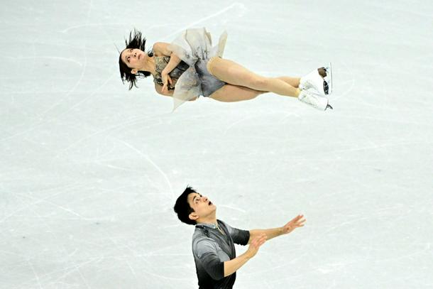 Defending Olympic champions Sui Wenjing and Han Cong of China finished fifth with 208.64 in their skate to “A Tapestry of a Legendary Land” after struggling with their jumps.