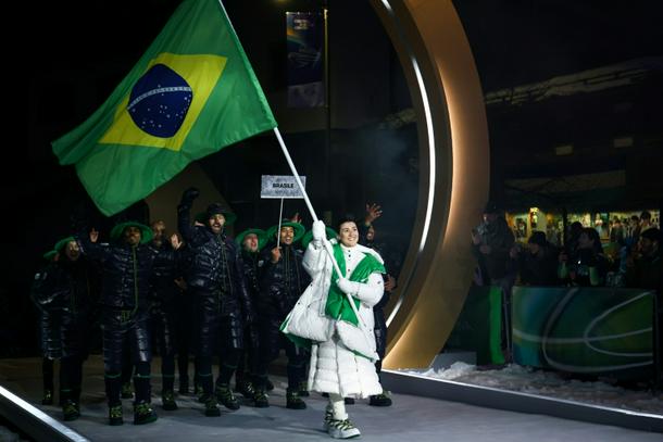 Nicole Silveira carrying the Brazilian flag in the Cortina d'Ampezzo Olympic opening ceremony