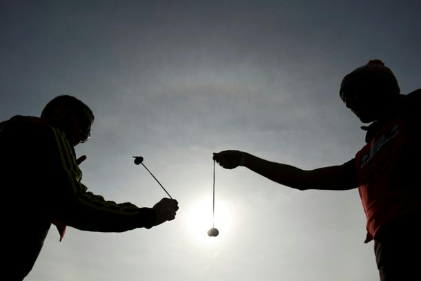 The aim of the game is to use a conker – the seed of horse chestnut trees – threaded onto a string to try to smash an opponent’s nut.