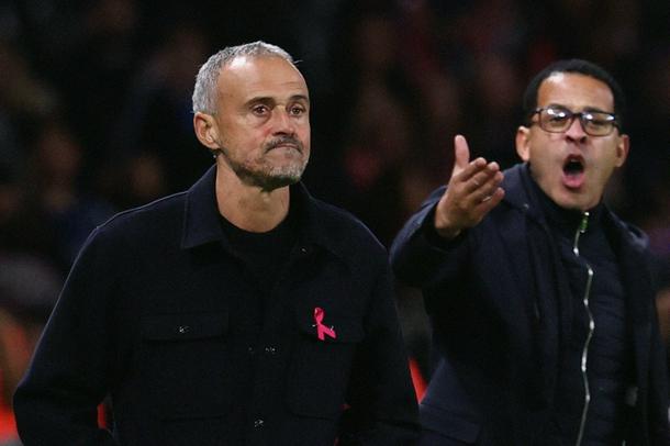 Rosenior on the touchline next to PSG coach Luis Enrique during Strasbourg's 3-3 draw in Paris in October