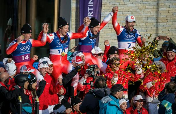 Switzerland's gold medallists Franjo von Allmen and Tanguy Nef (L) celebrate with teammates Marco Odermatt and Loic Meillard (R) after the Olympic men's team combined