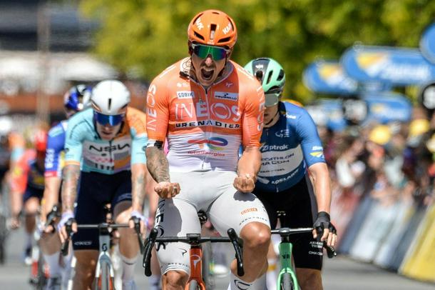 Ineos Grenadiers rider Sam Welsford celebrates winning stage three of the Tour Down Under