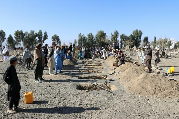 Afghan villagers dig graves for people the government said were killed in strikes by Pakistan