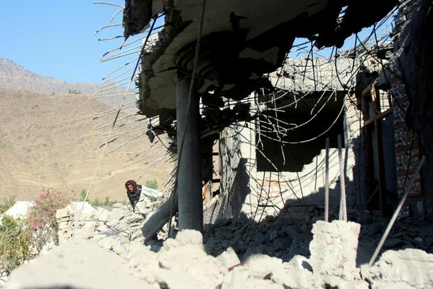A resident sits at a damaged house after an air strike Afghanistan's Taliban government blamed on Pakistan in Jige Mughalgai in Khost province