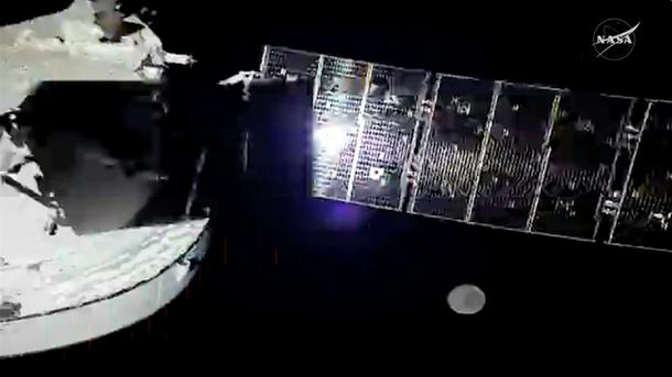 A NASA livestream shows the Orion spacecraft with one of its four solar array panels, with the Moon in the distance