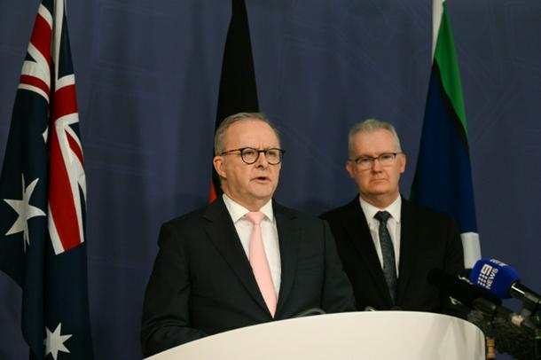Australia's Prime Minister Anthony Albanese (L) speaks on the Royal Commission on last year's mass shooting incident where two gunmen killed 15 people at Australia's Bondi Beach, while Home Affairs Minister Tony Burke (R) looks on during a press conference in Sydney on April 30, 2026