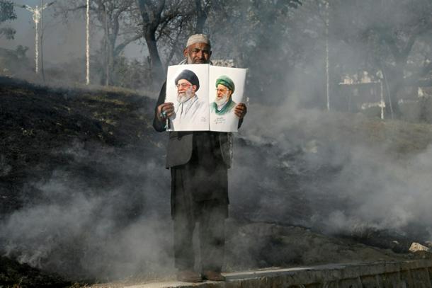 A man holds photos of Iran's late supreme leader Ayatollah Ali Khamenei as protesters attempt to storm the US embassy in Islamabad on March 1, 2026