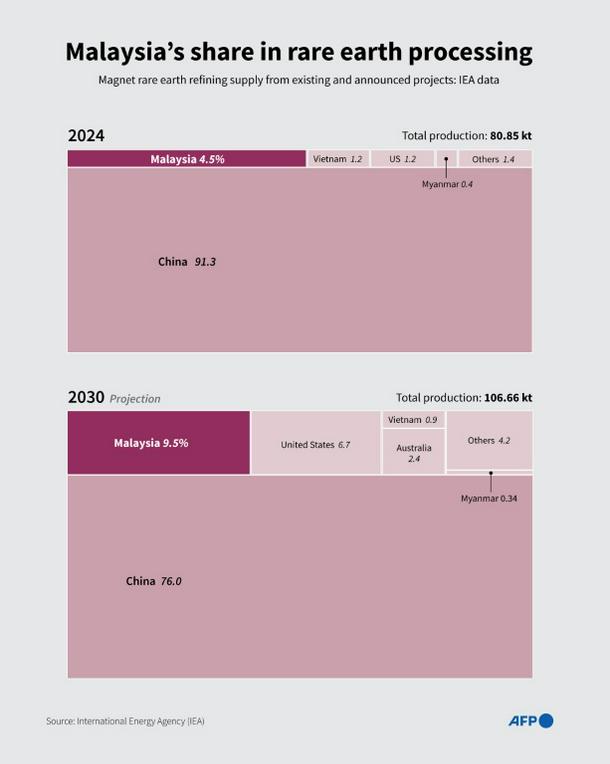 Gebeng (Malaysia) (AFP) - Workers load tonnes of rare earth minerals into bags ready for shipping at a refinery in eastern Malaysia, fuelling the global pushback against China’s grip on the critical sector.