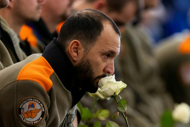 Civil protection personnel held white roses at the national memorial ceremony in Martigny