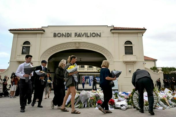 Mourners lay flowers at Bondi Pavilion after two gunmen killed 15 people in an attack on a Jewish festival at the world-famous beach