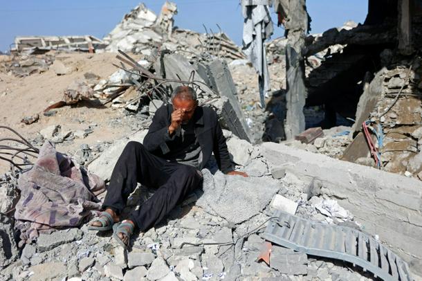 A man sits in the rubble of Sheikh Radwan police station in Gaza City after the Israeli air strike