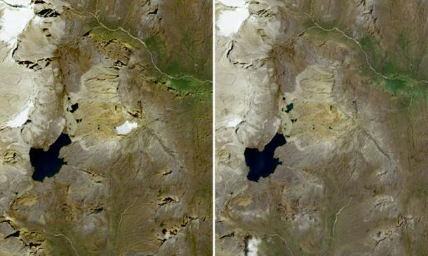 Satellite images show how the ice sheet covering the mountain gradually shrank from 2015 until it disappeared completely in March 2026.