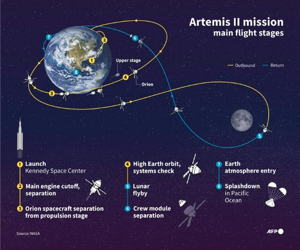 Infographic showing a schematic outline of the NASA's Artemis II mission voyage