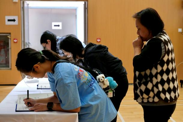 Mourners write in books as they pay their respects at a memorial point in Tai Po district