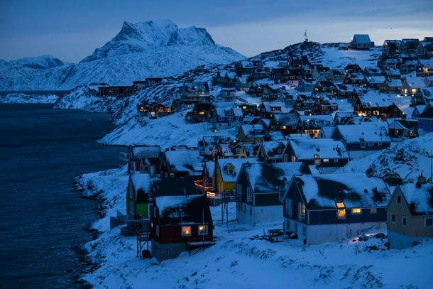 Locals stand on a snowy shoreline at dusk in Nuuk, Greenland