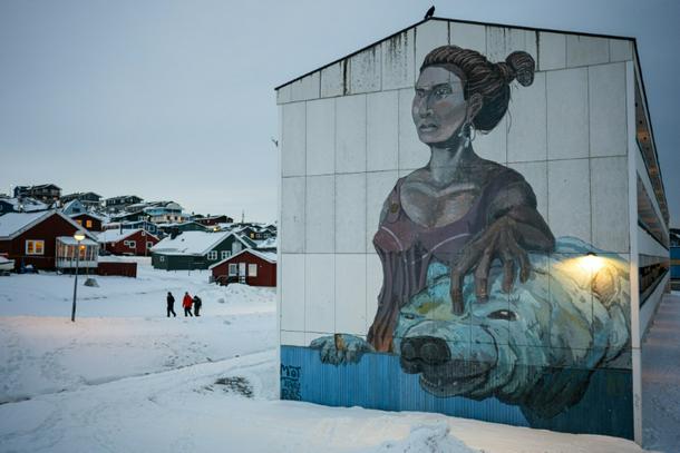 People walk past a large mural depicting a woman and a polar bear on the side of a building in Greenland's capital