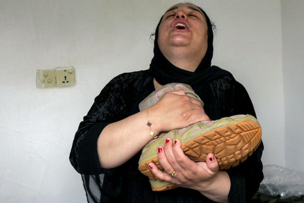 Fatima Muzafar, sister of an Iraqi Kurdish Peshmerga fighter killed in Iranian strikes on their military base, mourning him at his home in Soran, near the Iranian border