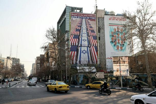 An anti-US and anti-Israel banner is displayed in Iran, which has warned against American military intervention over a deadly crackdown on protests