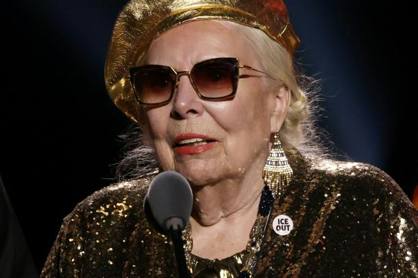 Joni Mitchell – one of several attendees wearing an “ICE OUT” pin in protest of US President Donald Trump’s sweeping immigration crackdown – took a prize for best historical album.