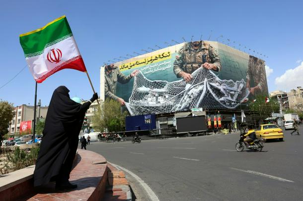 A woman holds Iran's national flag while standing near a billboard reading 'The Strait of Hormuz remains closed' at Enqelab Square in Tehran on April 5, 2026