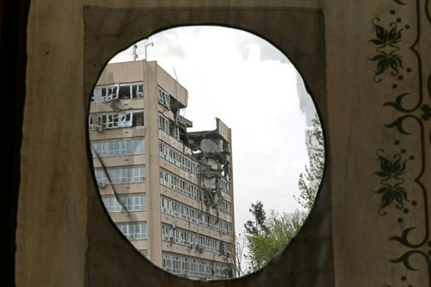 A building damaged by recent strikes is seen from the Golestan Palace in Tehran on April 4, 2026