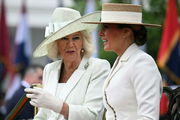 First Lady Melania Trump and Britain's Queen Camilla chatted during the arrival ceremony