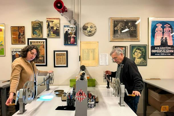 Nitrate Film Vault technician Courtney Holschuh (L) and vault leader George Willeman (R) unspool film on reels at the Library of Congress Audio-Visual Conservation Center
