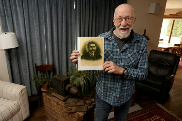 Bill McFarland holds up a photo of his great-grandfather, William DeLyle Frisbee, who left his family a cache of old silent movies
